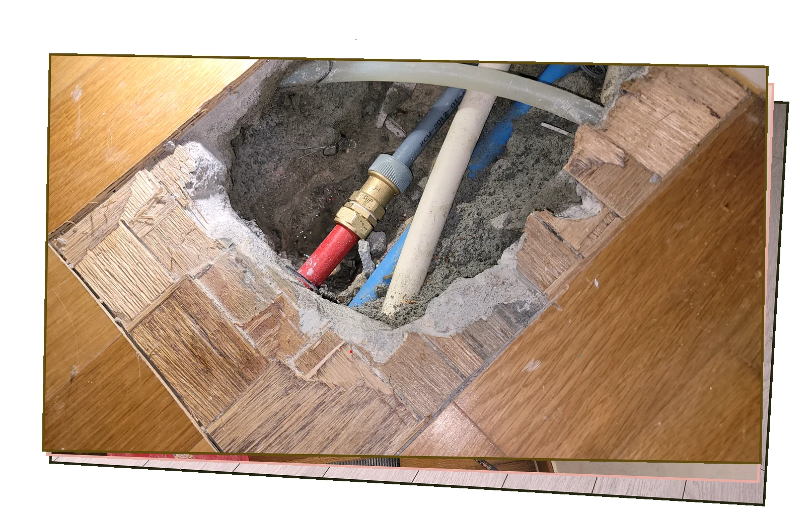 구석구석 조사한 결과 온수 배관의 부식 에서 물이 새고 있었습니다.
